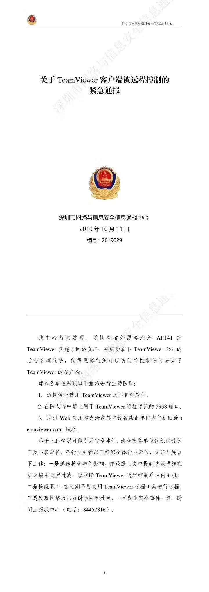根據深圳市網絡與信息安全信息通報中心檢測發現,近期有境外黑客組織APT41對TeamViewer 實施了網絡攻擊,并成功拿下TeamViewer 公司的后臺管理系統,使得黑客組織可以訪問并控制任何安裝了TeamViewer 的客戶端。